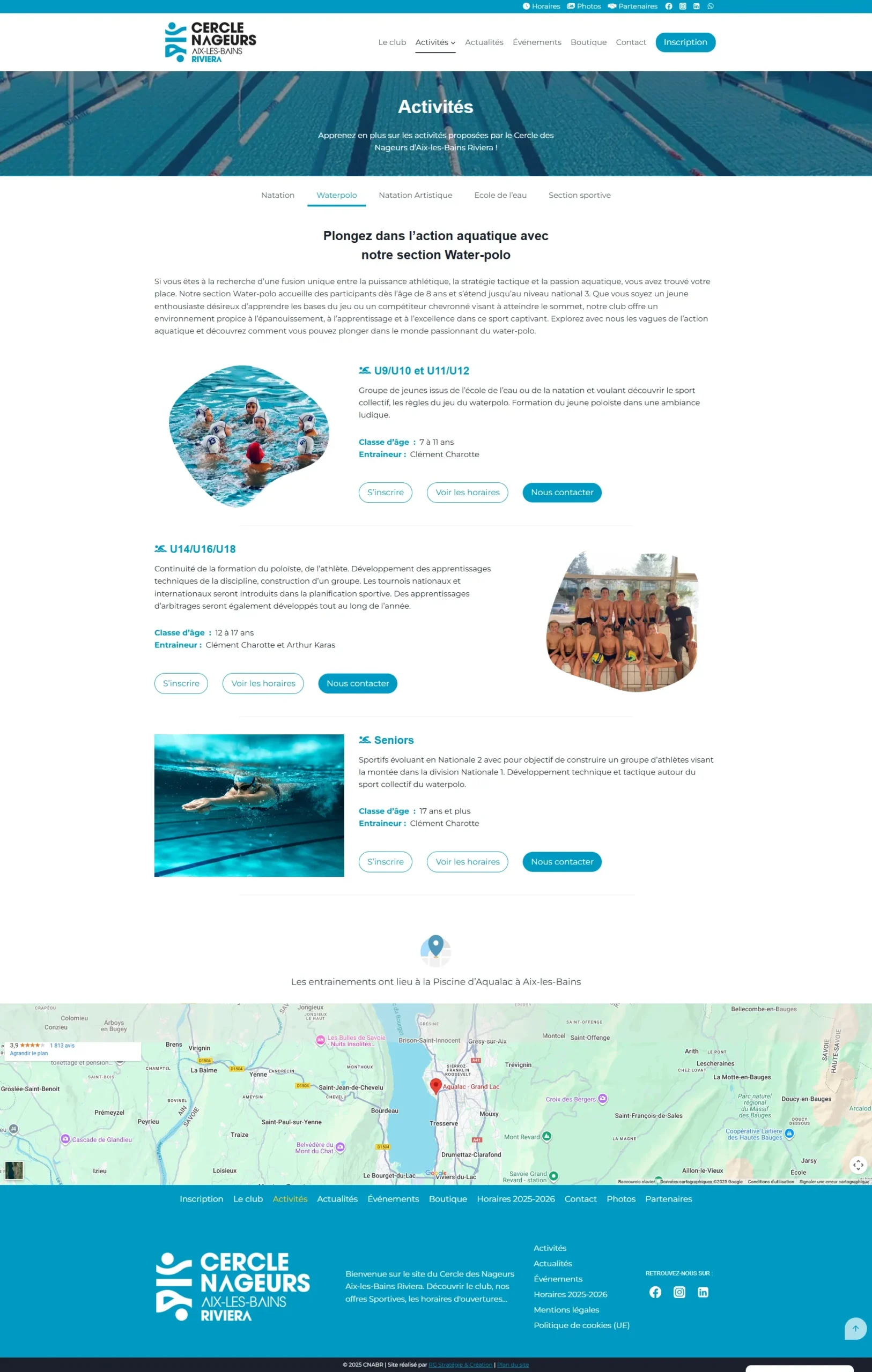 Pages dédiées à chaque activité (école de natation, compétition, loisir, water-polo, synchronisée, etc.) pour une compréhension immédiate des offres du club